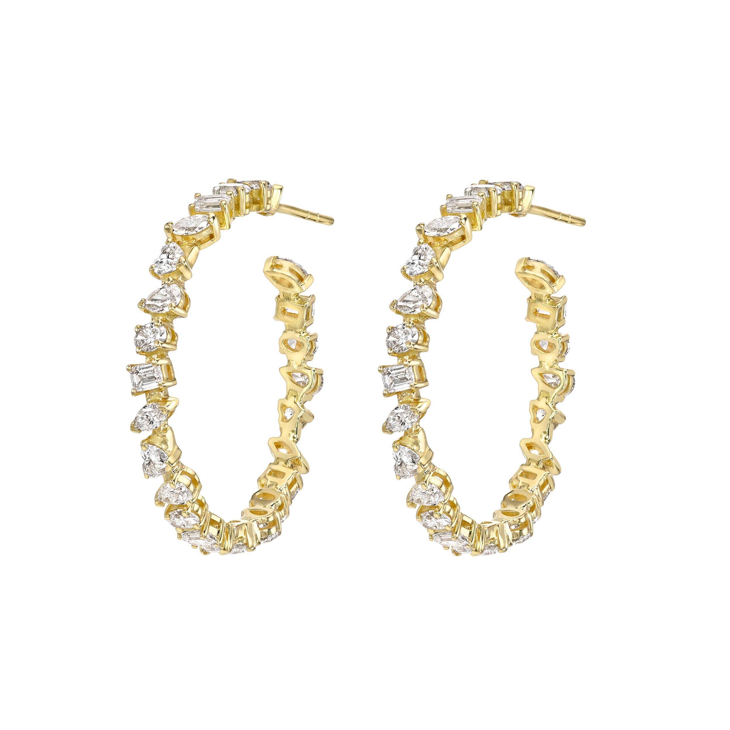 Crafted in 18k gold with 4.24ctw of multi-shape white diamonds, the Baby Fortuna Diamond Hoops embody the goddess of luck and fortune herself. Each diamond shape carries symbolic meaning—round for oneness, marquise for intuition, heart for purpose, square for logic, and pear for emotion. Together, they mirror the balance of fate and free will, serving as a reminder that luck often meets those who follow their calling.