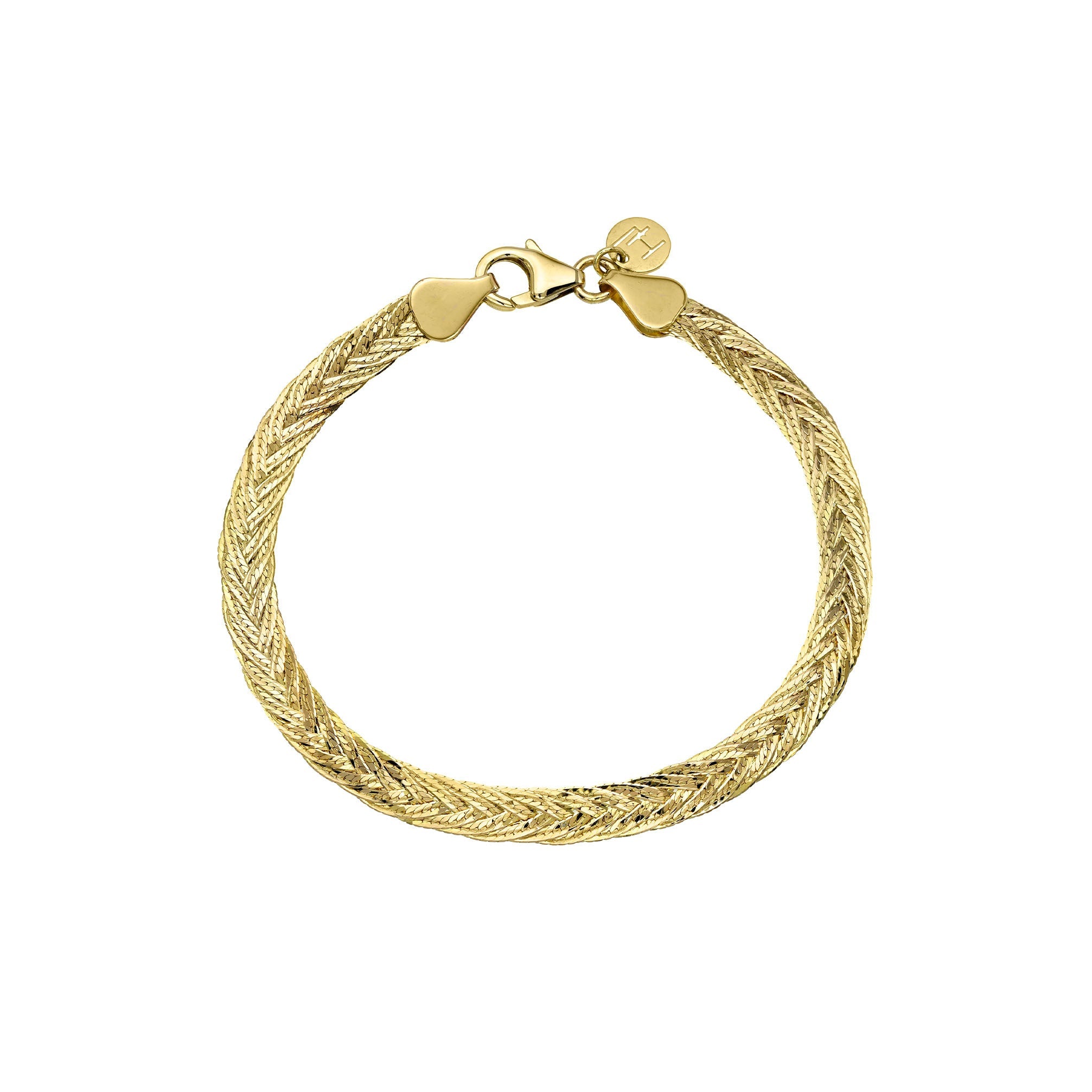 This braided herringbone bracelet is a refined twist on the classic chain, crafted in 14k gold with intricate texture and a soft, fluid drape that hugs the wrist like a second skin. Timeless on its own, powerful in a stack—this is a daily heirloom in the making.