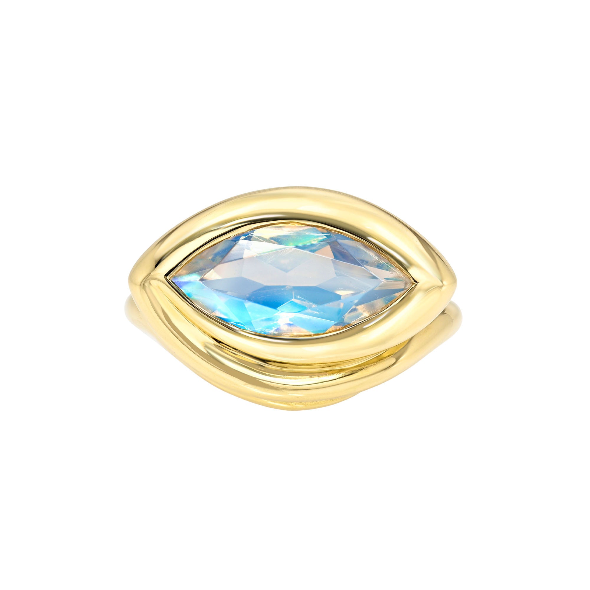 The Enigma Angel Eye Ring is reimagined with a 2.10ct marquise moonstone, glowing with the ethereal, shifting light the stone is known for. Held in sculptural 18k gold, it becomes a luminous talisman that reflects intuition, emotional clarity, and the quiet strength found in stillness. Moonstone, tied to the divine feminine and the rhythms of the moon, brings a sense of inner guidance and gentle protection. This ring is designed to remind you to trust your instinctive knowing, move with softness, and follow the light that only you can see.