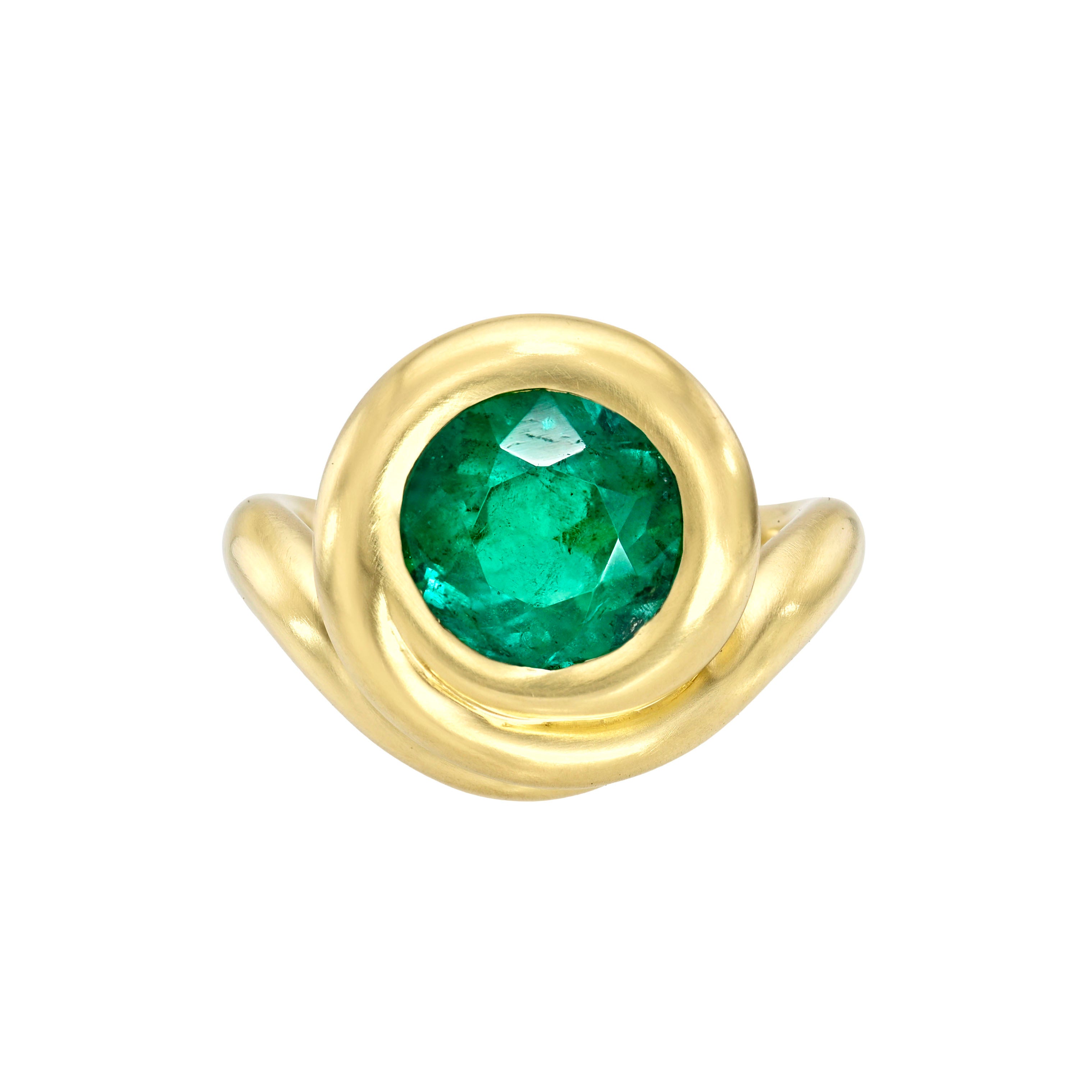 Crafted in 18k yellow gold, this sculptural ring features a 2.49ct Colombian emerald—bold, vibrant, and cloaked in mystique. Its fluid, swirling form is a tribute to those who are magnetic yet unknowable.