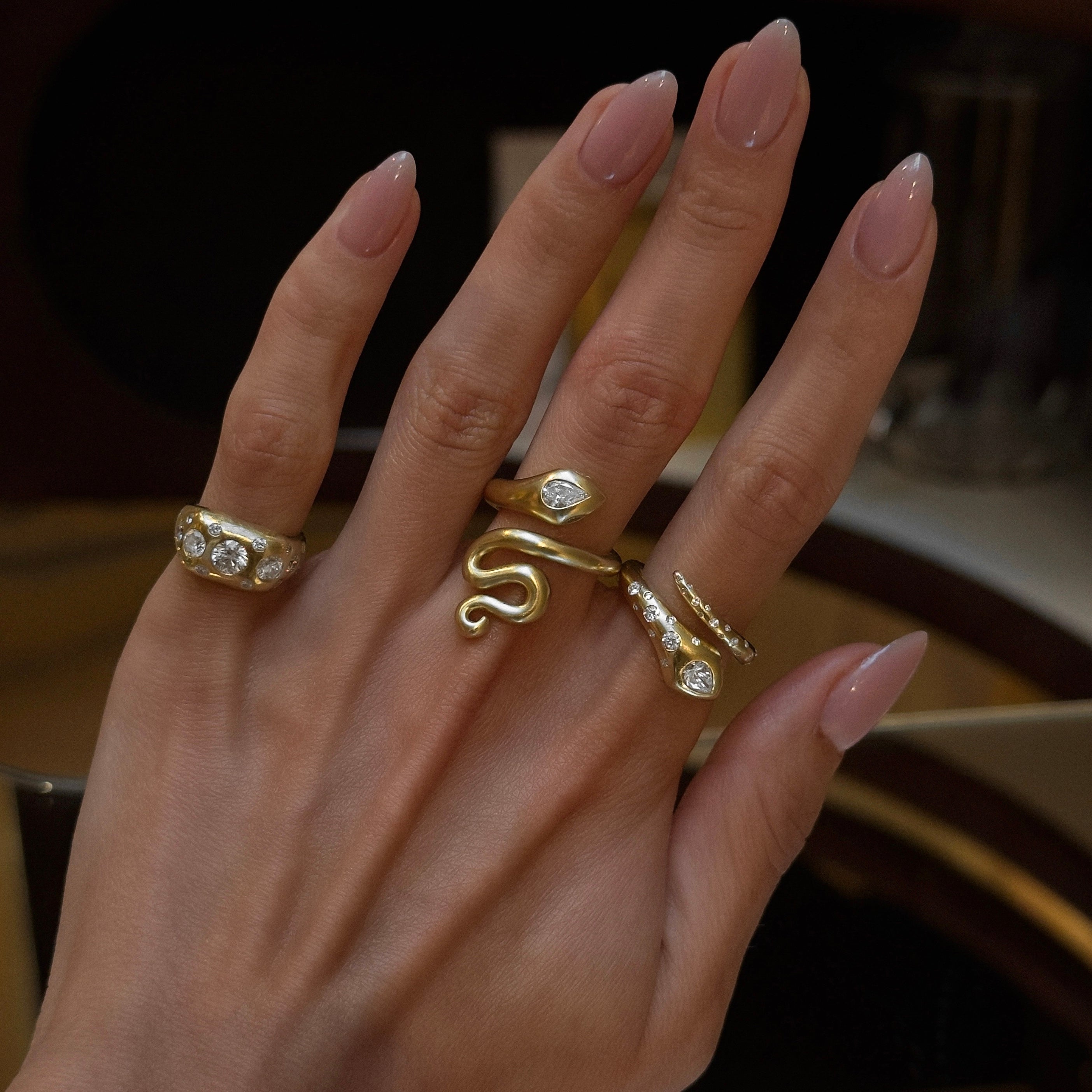 Inspired by the ancient symbol of awakened energy, the Kundalini Diamond Oracle Ring coils around the finger like a snake. With a pear-cut diamond set like a third eye and bezel-set diamonds scattered like sacred codes, this talisman channels intuition, energy, and protection.