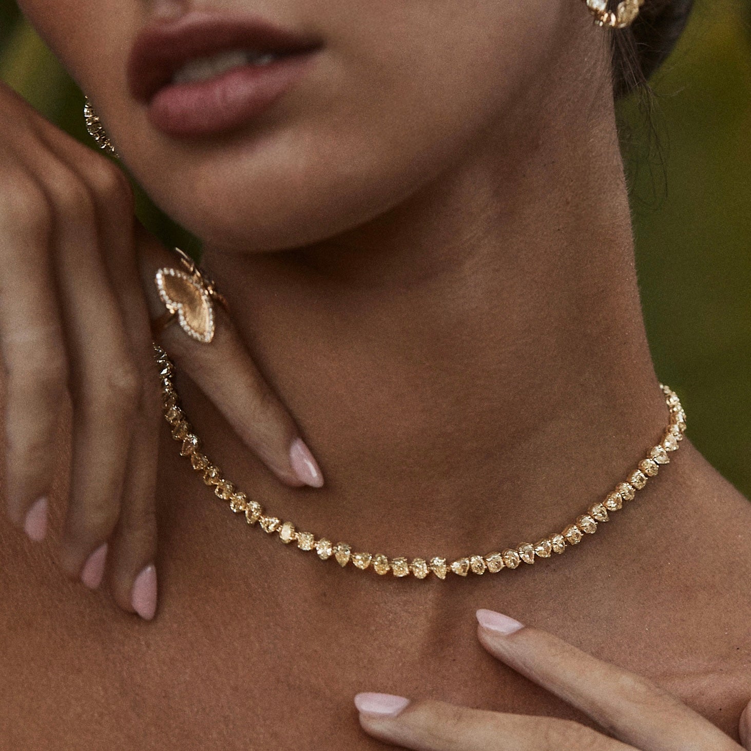 Fortuna Tennis Necklace with Fancy Yellow Diamonds, a divine embodiment of luck and fortune inspired by the Roman goddess herself. Fortuna, the goddess of fortune and luck, serves as the muse for this exquisite piece, seamlessly blending elegance with the whims of fate. Crafted in 18k gold, this piece is a manifestation of Fortuna's powers. Each diamond, reflects the goddess's ability to randomize and bring luck, adding a touch of celestial brilliance to the wearer. Round - Oneness Marquis - Intuition Heart - Follow your Purpose Square - Logic Pear- Emotion Let these diamonds symbolize the fortune that awaits, knowing that you carry a touch of divine luck wherever life's journey takes you.
