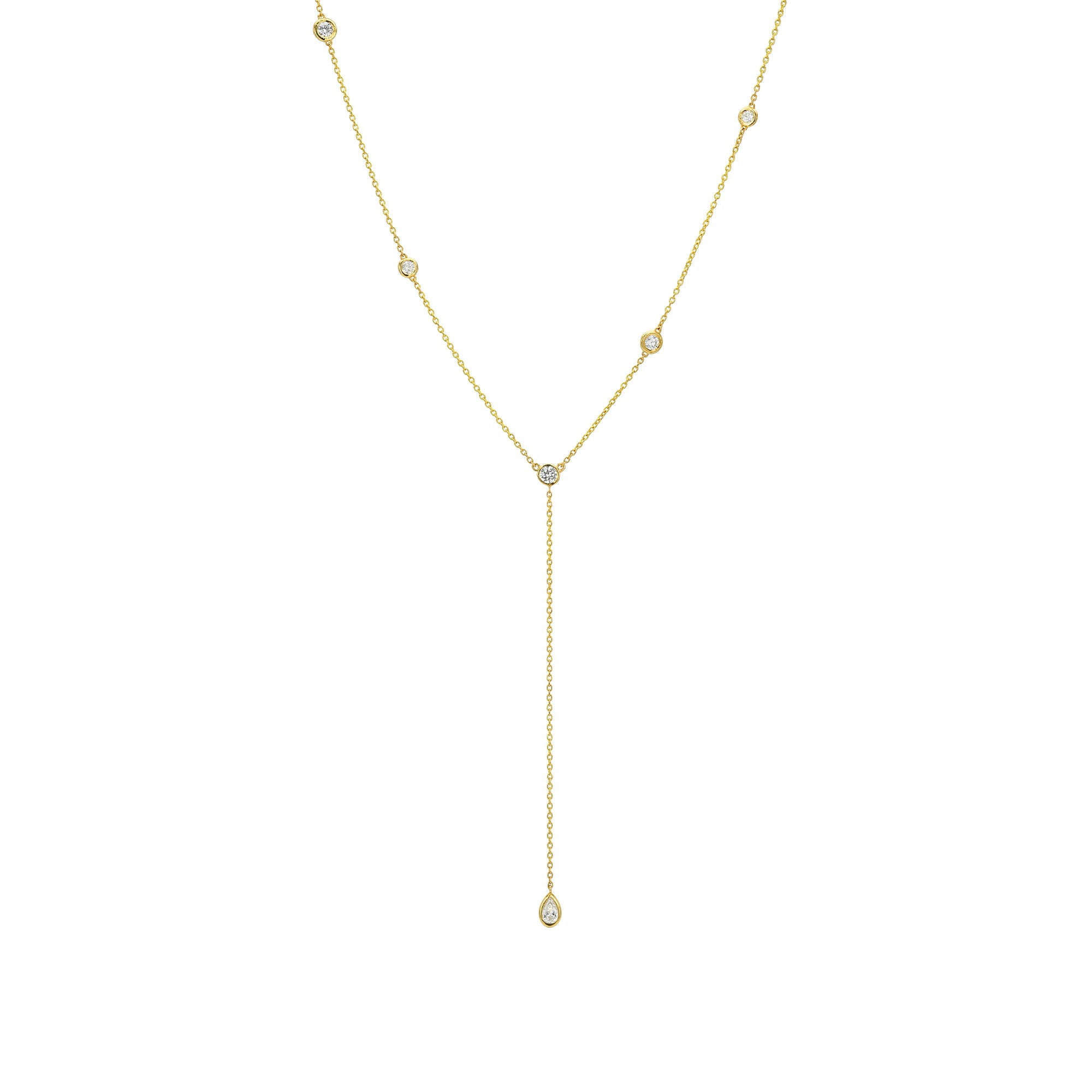 Crafted in 14k yellow gold, this lariat necklace features bezel-set white diamonds that shimmer like stars. Each stone feels like a moment frozen in time, guiding the gaze down to a single pear-shaped diamond drop. Symbolizing clarity and emotional release, the drop draws attention to the heart space, inviting trust in the flow of life.