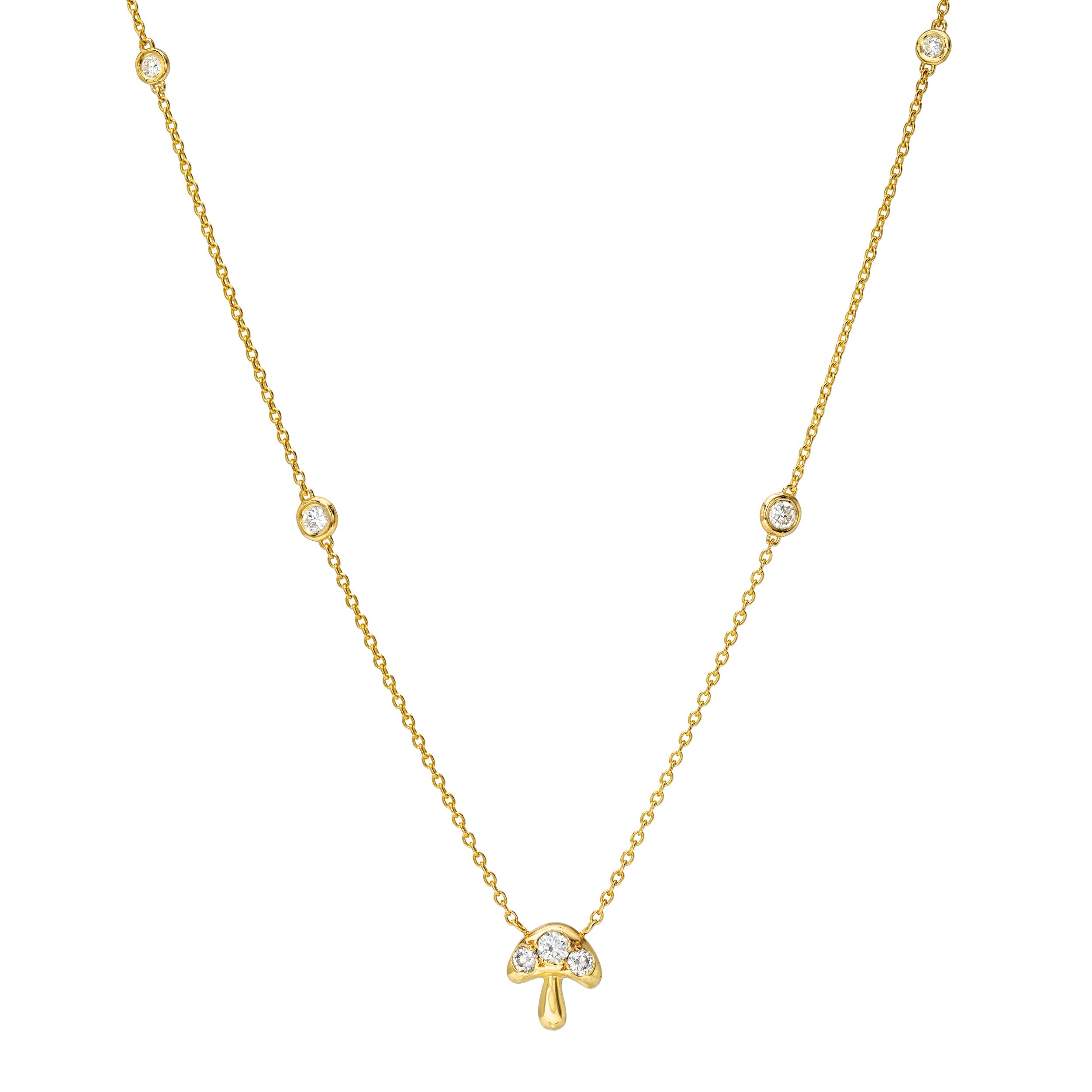 Crafted in 14k yellow gold, the Mushroom Orbit Diamond Necklace is a connection to nature and earth itself. At its center, a diamond pavé mushroom reminds us that beauty often flourishes in unexpected places. The design is accented with bezel-set station diamonds, orbiting like points of light around the pendant.