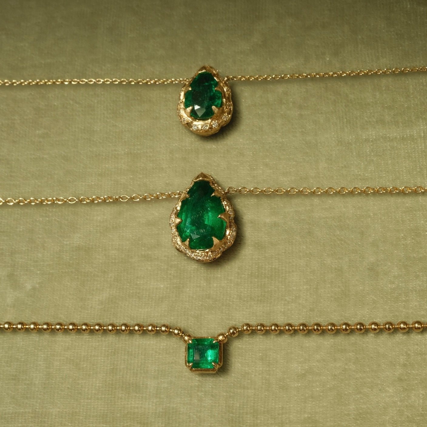 18k gold pear-shaped vibrant Colombian emerald from the Queen collection with a .15ct sprinkled white diamond halo. Available on an adjustable 16"-18" chain.