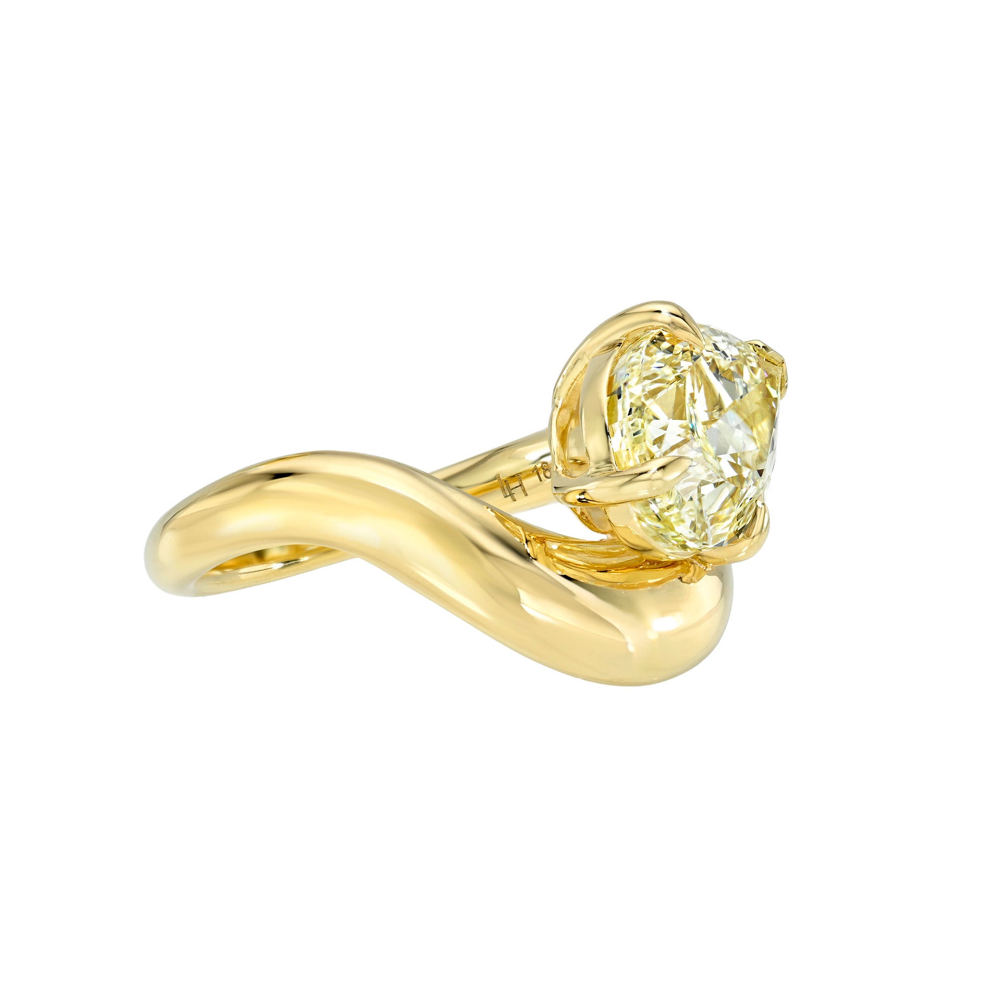 The Enigma Floating Diamond Ring is an expression of quiet power and rare beauty. Handcrafted in 18k gold, it features a striking 5.01 carat pear-shaped fancy light yellow diamond that appears to float effortlessly above the band, allowing light to enter from every angle. Its warm hue and elongated silhouette create a refined yet modern presence on the hand.