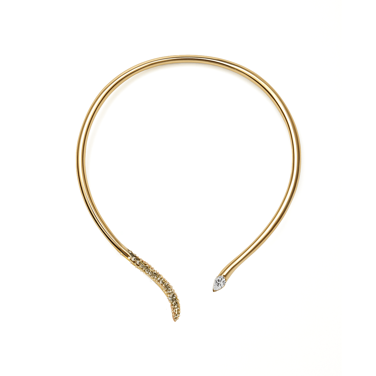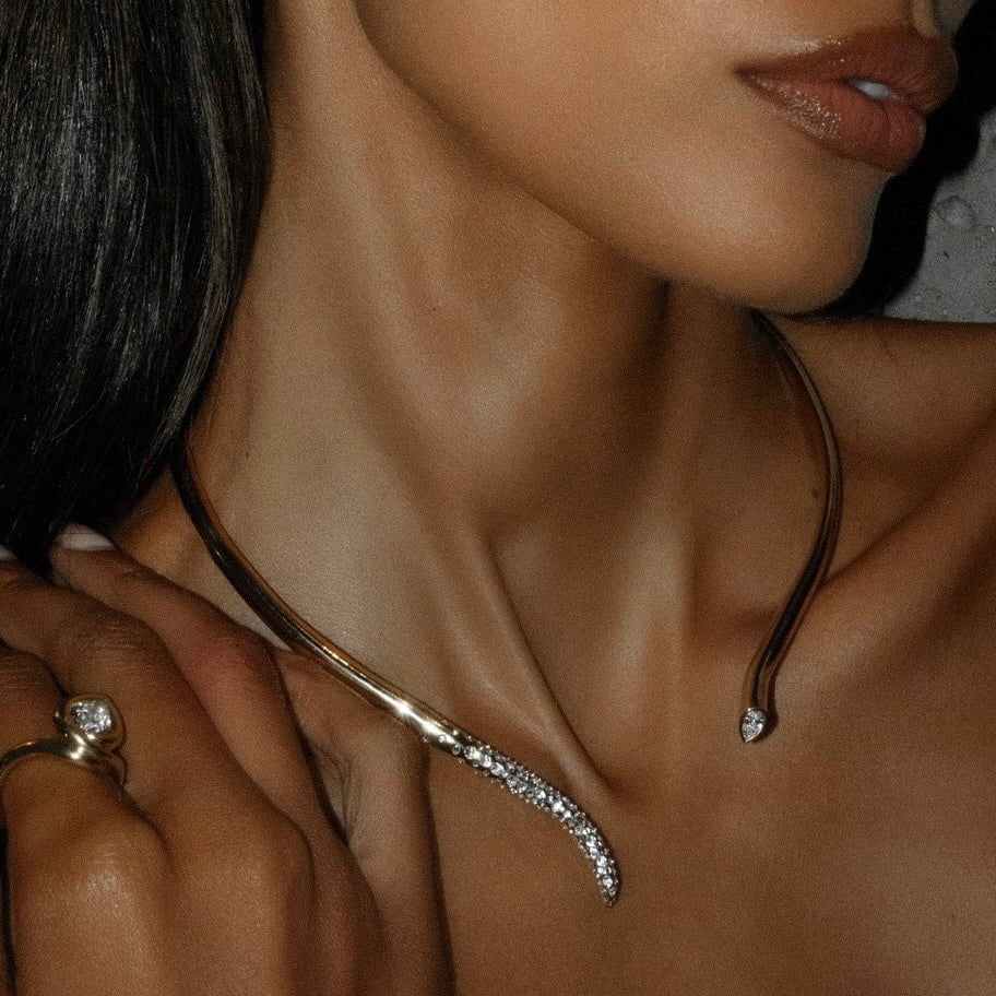 Crafted in solid 14k gold, this sculptural collar embodies the strength and symbolism of the elephant tusk —an emblem of strength, honor, and stability. One side curves into a 0.42ct pear-shaped diamond, while the other shimmers with a trail of 1.03ct of round inverted pavé white diamonds sprinkled like stardust. Its finished with a hidden hinge at the back for ease.
